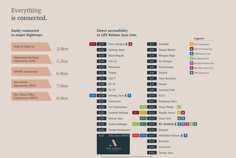 Experience true connectivity at Atera PJ—only 400m to Asia Jaya LRT with direct links to KL Sentral, KLCC, and key city hubs. Easily accessible via major highways including Federal Highway, LDP, SPRINT, NPE, and NKVE.